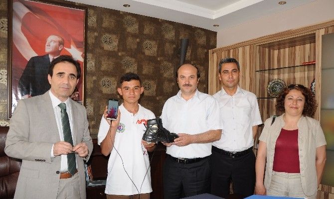 Konuşmaların ardından Erdemli kaymakamı Osman Taştan, 15 yaşındaki mucidi altınla ödüllendirdi.