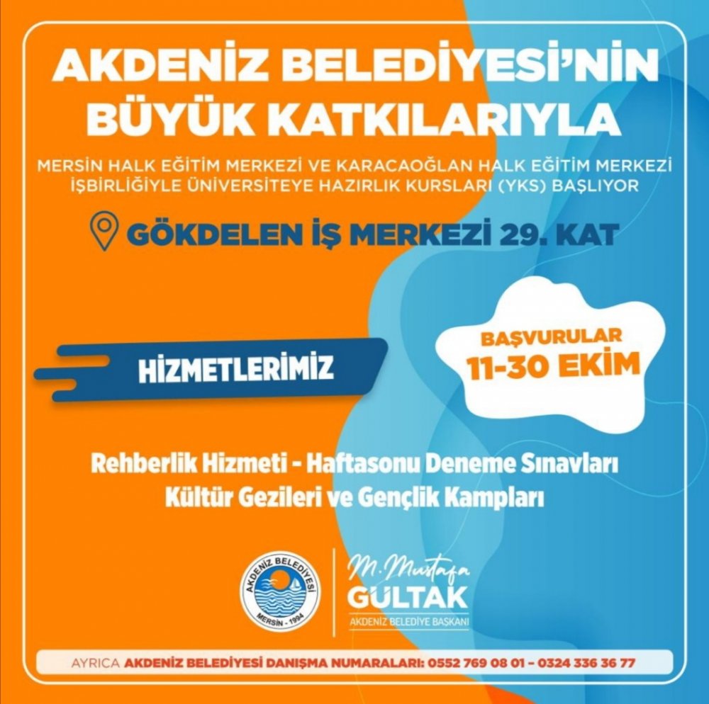 Akdeniz Belediyesi’nin; Mersin Halk Eğitim Merkezi ile Karacaoğlan Halk Eğitim Merkezi işbirliğiyle düzenlediği ücretsiz üniversiteye hazırlık kursları başlıyor.
