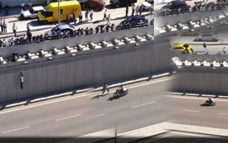Eli kelepçeli C.Ö., yaklaşık 10 metre yüksekten sarktı ve alt geçide indi. Bu sırada bir motosiklet hızla şahsa yaklaştı. C.Ö. de toparlanarak motosiklete bindi. Motosiklet hızla bölgeden uzaklaştı.