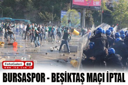 Bugün saat 20.00'de Atatürk Stadyumu'nda oynanması gereken Bursaspor-Beşiktaş maçı, çıkan olaylar üzerine iptal edildi. Bursaspor taraftarlarının polis ekiplerini ve 34 plakalı araçları taşmaları üzerine, güvenlik gerekçesiyle maçın iptal edilmesine karar verildi. Gerginlik hala devam ederken, polis mermi ve göz yaşartıcı bombalarla taraftarlara müdahale ediyor. Emniyet Müdürü Halil Yılmaz da öfkeli taraftarların arasında kaldı.